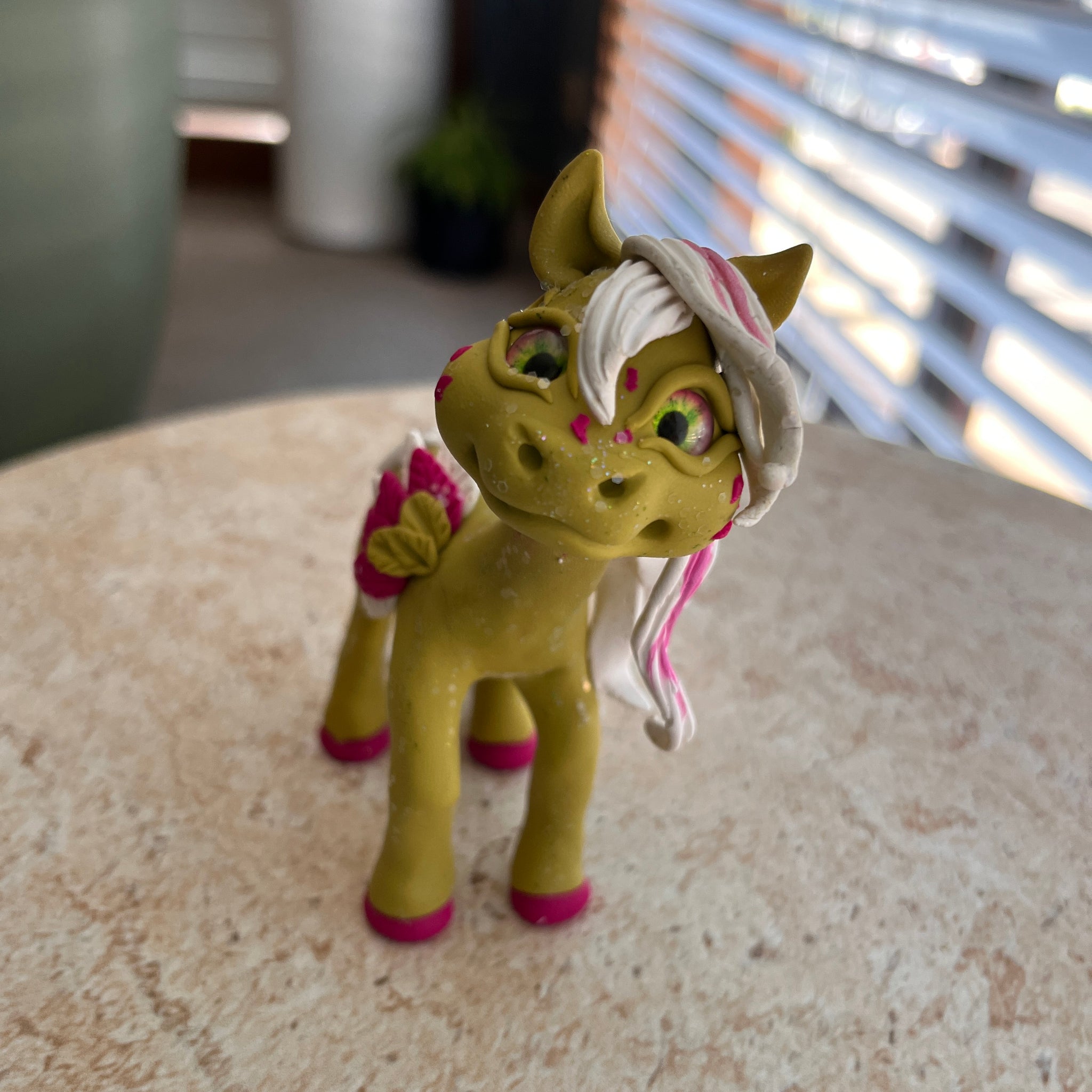 Winky is made from coloured polymer clay with no paint, so is just as happy outside in the garden as on a shelf inside. And can be used as a cake topper for the big event, then just wash it off and keep it forever.
